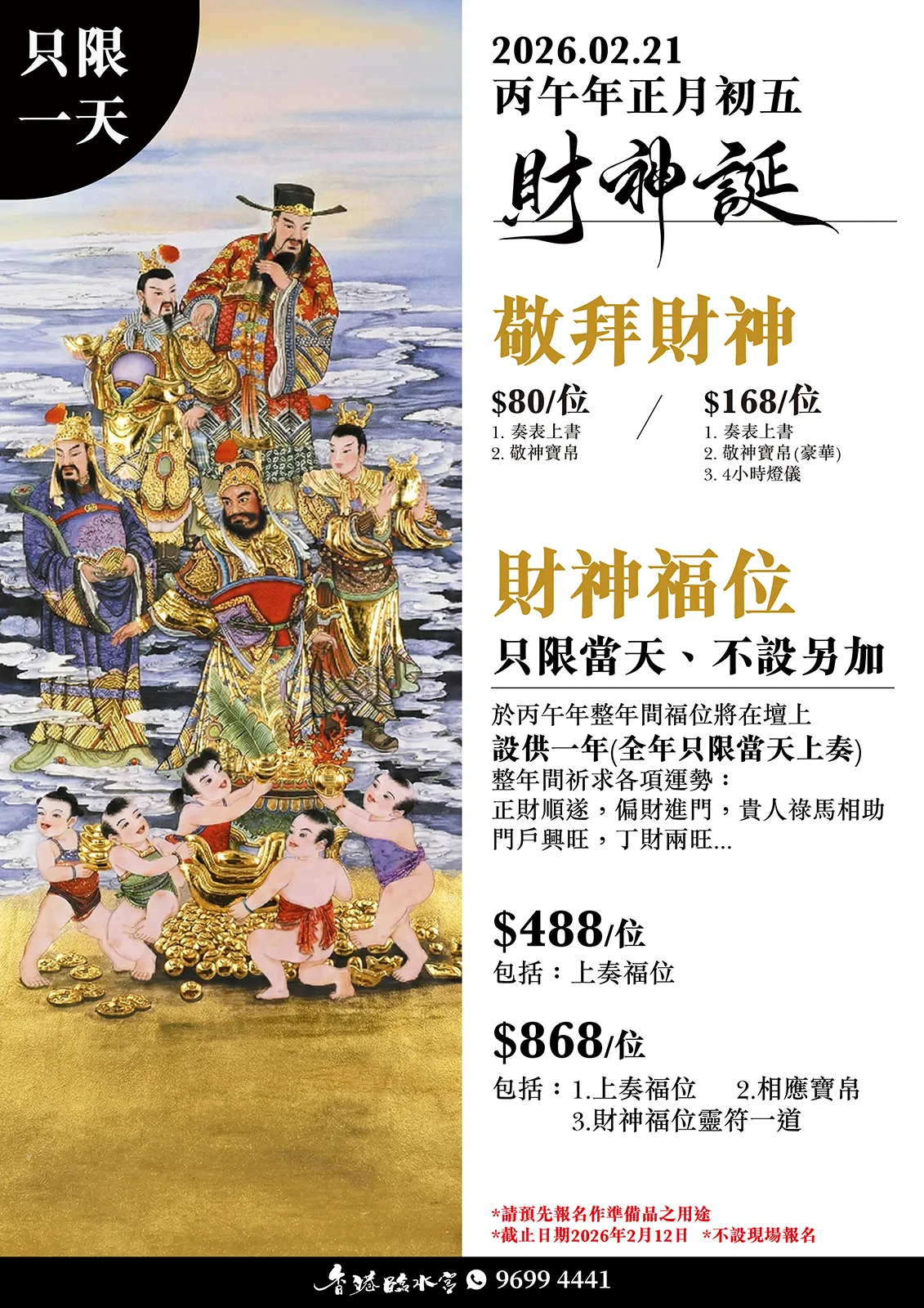 除了敬拜財神外,全年唯獨此日,本館設奉財神福位,以符法福位為每位參加善信許福並全年供奉。